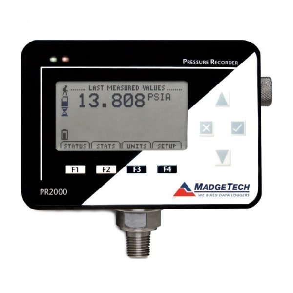30 PSIA Pressure recorder with LCD Display and universal power supply The PR2000 is a pressure data logger with NPT fitting and LCD for real-time monitoring. Includes ISO17025 accredited calibration certificate. Digital Display 1/4 Inch NPT Fitting Memory Capacity of 262,000 Readings > The PR2000 is a pressure data logger with an LCD and wall mounted universal power adapter. Available in 10 ranges, the PR2000 can adapt to any application and features a 1/4 in. NPT fitting for quick connection. The 8-button keypad and LCD provide convenient access to current statistics (min, max, average), recording status, display options and calibration information. With the ability to measure and record data up to 262,144 readings, the PR2000 has one of the largest memory capacities of any similar data logger on the market. The PR2000 is compatible with the latest MadgeTech 4 Software making starting, stopping, and downloading simple and easy. Graphical, tabular, and summary data is provided for analysis and can be viewed as customizable engineering units.